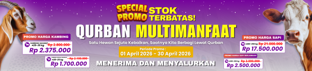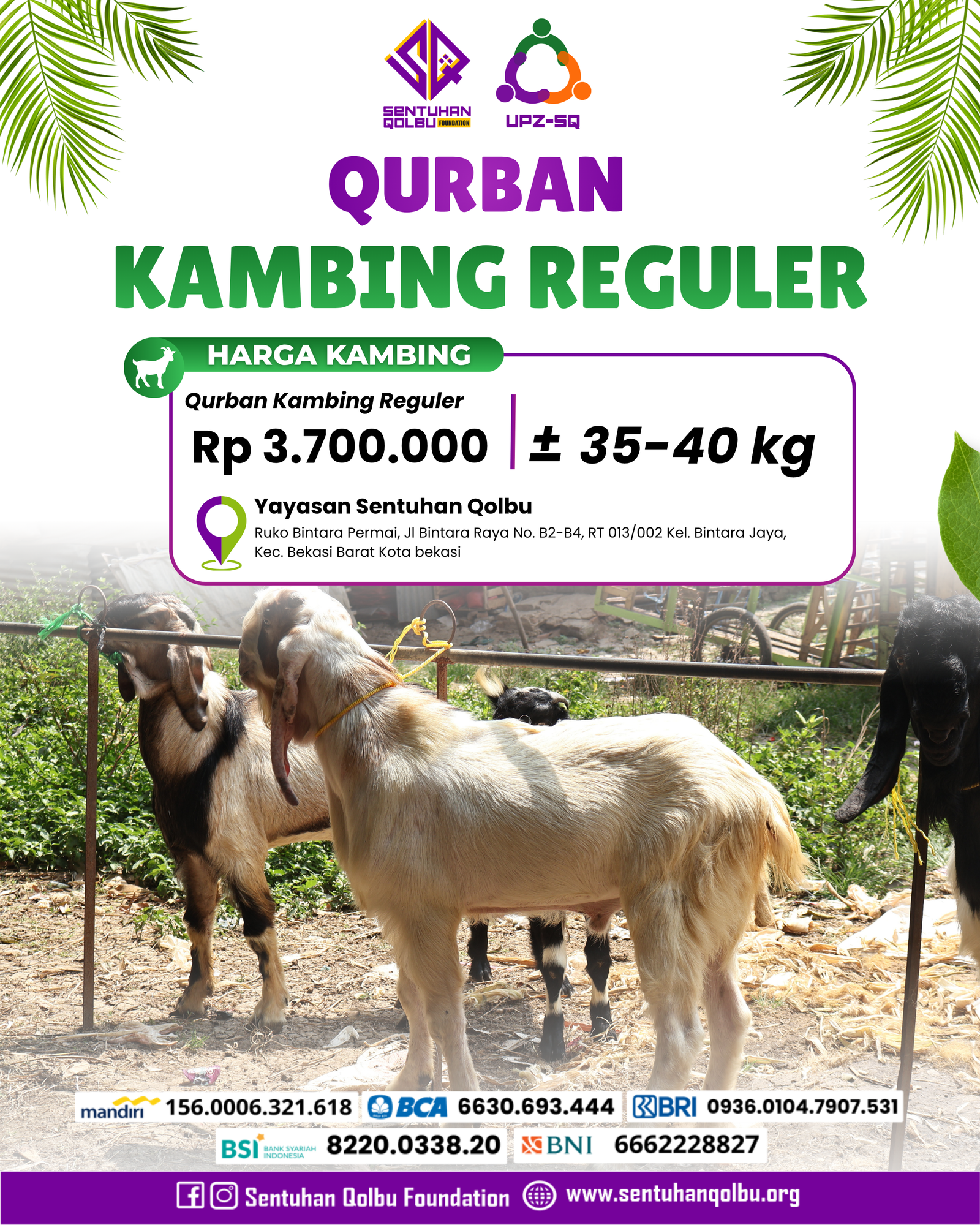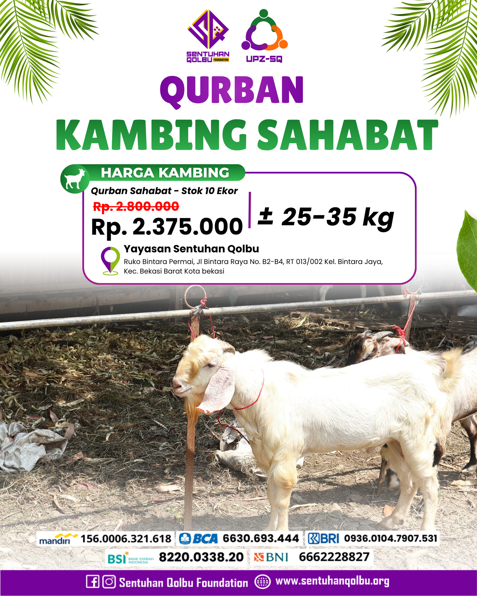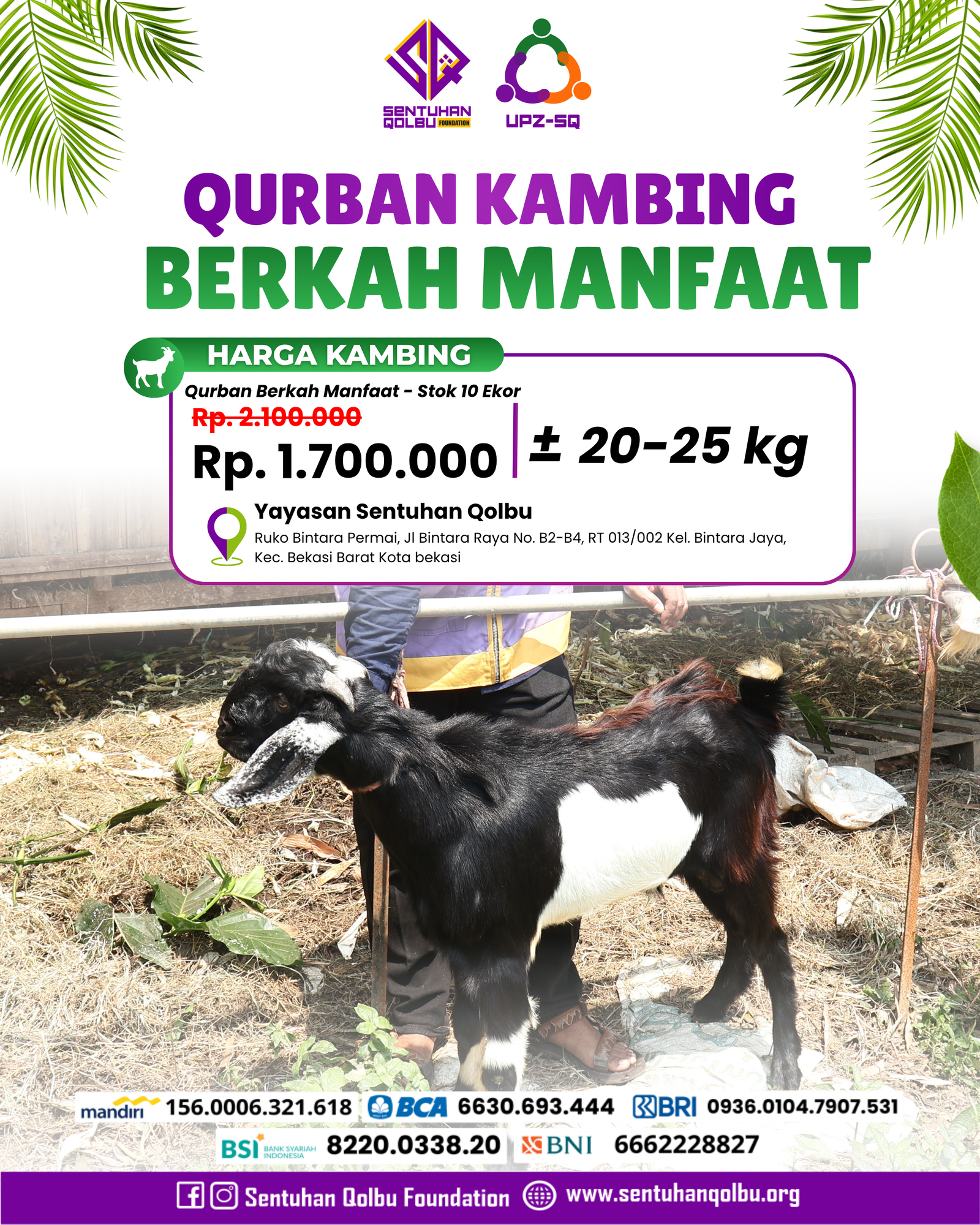 Program Qurban PROMO KAMBING Qurban Kambing Spesial Yayasan Sentuhan Qolbu Rp 0terkumpul ∞ Qurban Sekarang Qurban Kambing Reguler Yayasan Sentuhan Qolbu Rp 0terkumpul ∞ Qurban Sekarang Qurban Kambing Sahabat Yayasan Sentuhan Qolbu Rp 0terkumpul ∞ Qurban Sekarang Qurban Kambing Berkah Manfaat Yayasan Sentuhan Qolbu Rp 1.700.000terkumpul A ∞ Qurban Sekarang PROMO SAPI Qurban Sapi Berkah Manfaat Yayasan Sentuhan Qolbu Rp 0terkumpul ∞ Qurban Sekarang Qurban Sapi Spesial Yayasan Sentuhan Qolbu Rp 0terkumpul ∞ Qurban Sekarang